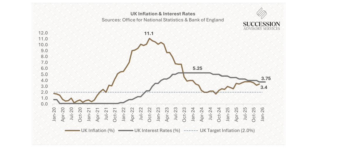 In response, the Bank of England kept interest rates unchanged at 3.75% at its February meeting. The Bank reiterated its view that inflation is expected to slow much more than previously expected falling towards its 2% target from April, and that there may be scope for further interest rate cuts later this year3.